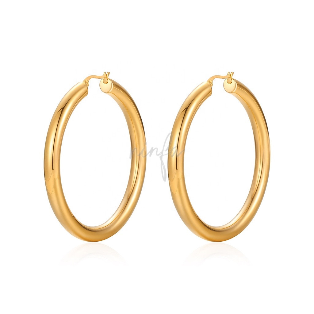 Parell d'arracades en forma d'aret, de material Acer de color Gold PVD de 5mm de gruix i 50mm de diàmetre extern. Resistent a l'aigua, a la suor i al desgast. Tancament segur i còmode, ideals per a pells sensibles.