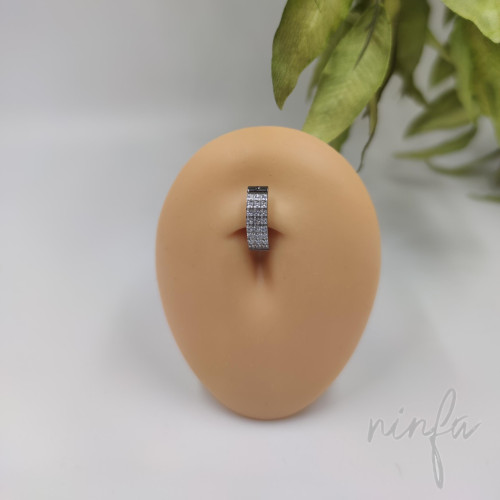 Pírcing per al melic de material Titani ASTM F136 amb forma ovalada i amb circonites. El tancament clicker fa que sigui fàcil la seva col·locació. La barreta mesura 1.6x10. Aquesta peça a més de ser d'un material biocompatible amb el cos, és el pírcing que farà que enlluernis allà on vagis. És una peça única.
