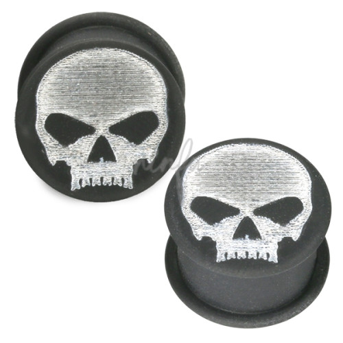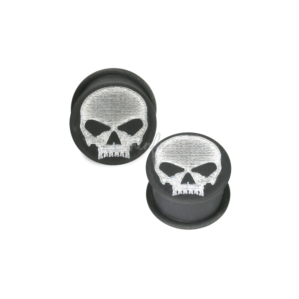 Dilatación de material Silicona sin agujero con dibujo de calavera. Medidas disponibles desde 12mm hasta 25mm. Estas dilataciones son geniales porque no pesan, son cómodas, ligeras y las puedes llevar con cualquier look.