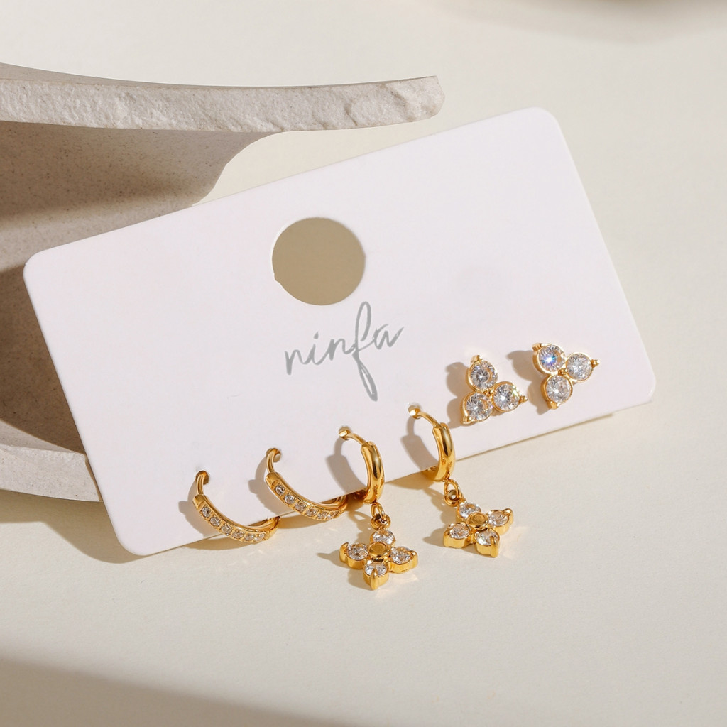 Te ofrecemos un pack con 2 pares de aritos de material Acero de color Gold PVD, uno con brillantes (diámetro interno 8mm) y el otro con un colgante (diámetro interno 6mm) y además otro par de pentientes con trinity de circonitas pequeñas. Recibirás en total 6 pendientes para que las combines si tienes varias perforaciones en tu orejita. Combina delicadeza y resistencia, perfectos para el día a día.
