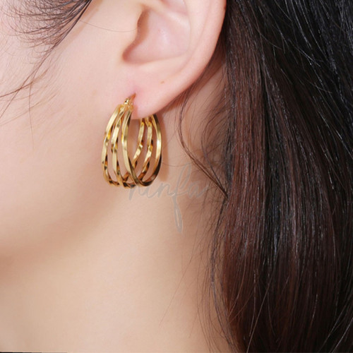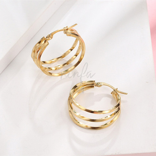 Par de pendientes en forma de aro de material Acero color Gold PVD, de 20mm de diámetro interno. Está compuesto por tres aritos retorcidos. Resistente al agua, al sudor y al desgaste.